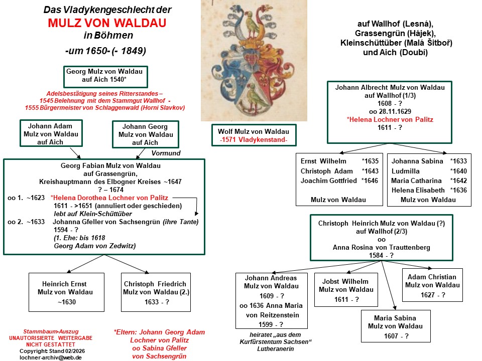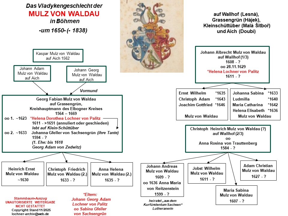 Ihre Zwillingstöchter heiraten, wie ihr Bruder, in das alte tschechische Vladykengeschlecht der Mulz von Waldau auf Wallhof (Lesná) im Kreis Elbogen (Loket) ein (dort ab 1651 rekatholisiert) und halten ihren Besitz bis 1838 (das dortige Schloss wird 1974 abgerissen). Helena Dorothea Lochner von Palitz ist um 1623 dem Kreishauptmann von Elbogen (Loket), Georg Fabian Mulz von Waldau auf Grassengrün (Hájek) im Kreis Karlsbad (Karlovy Vary) angetraut worden, und ihre Schwester Helena mit Johann Albrecht Mulz von Waldau auf Wallhof (Lesná) am 28. November 1629. Helena Dorothea Lochner von Palitz lässt die Ehe etwa 10 Jahre nach ihrer Heirat um 1633 annullieren (oder scheiden), und lebt fortan auf dem Mulz’schen Besitz Kleinschüttüber (Malá Šitboř); daraufhin geht Georg Fabian ein zweites Mal die Ehe ein mit Johanna Gfeller von Sachsengrün, der Schwester ihrer Mutter (siehe Anhang: Stammbaum der Mulz von Waldau).