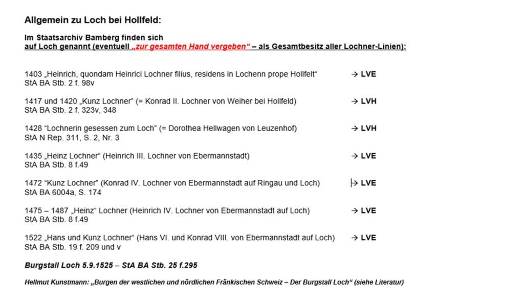 So lässt sich in dem Zusammenhang feststellen, dass sich die Lochner am oberen Lauf der Wiesent niederlassen (das heutige Örtchen Loch bei Hollfeld liegt direkt an der B22 zwischen Bamberg und Bayreuth), wo man auf dem Plateau des Hohen Knock über der Ortschaft (hier hat bereits eine keltische Fliehburg der Latène-Zeit gestanden) einen herrlich weiten Blick über das Tal hat, ideal also zur Errichtung und Verteidigung einer Burg, was sicherlich um die Zeit der Fränkischen Landnahme dem Typus der Motte (oder Turmhügelburg – siehe unten) entspricht. Zwischen Neidenstein und Weiher bei Hollfeld zieht sich der sogenannte Lochnergrund und als Flurnamen sind Burggasse und Turmholz in Loch erhalten.