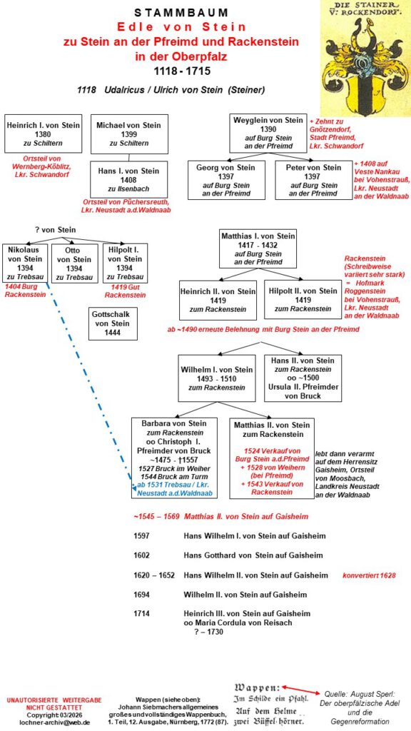Dr. Elisabeth Müller-Luckner: „Nabburg“, Historischer Atlas von Bayern, Altbayern Heft 50, Kommission für Bayerische Landesgeschichte, Verlag Michael Lassleben, München, 1981 (Stammbaum der Edlen von Stein zu Stein an der Pfreimd und Rackenstein: Staatsarchiv Amberg Reg/Kdl Nr. 8466)