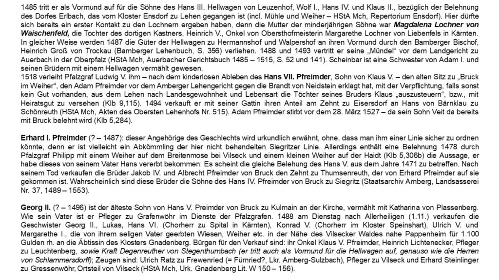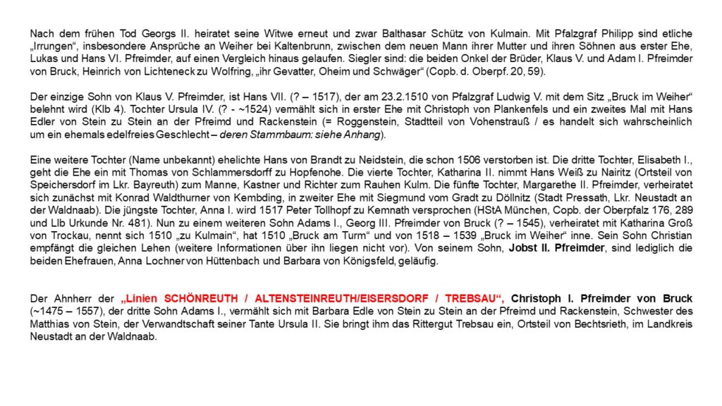 Verhandlungen des Historischen Vereins für Regensburg und Oberpfalz: „Stammliste der Pfreimder von Bruck“ (Älterer Teil) – nach den Forschungen des Edwin von Rauscher, bearbeitet von Dr. Lambert Graf von Oberndorff und Dr. Armin Schlegel – 87. Band, 1937 – incl. STAMMBAUM II 1550 – 1750 – zur Verfügung gestellt von Norbert Sack, Weidenberg