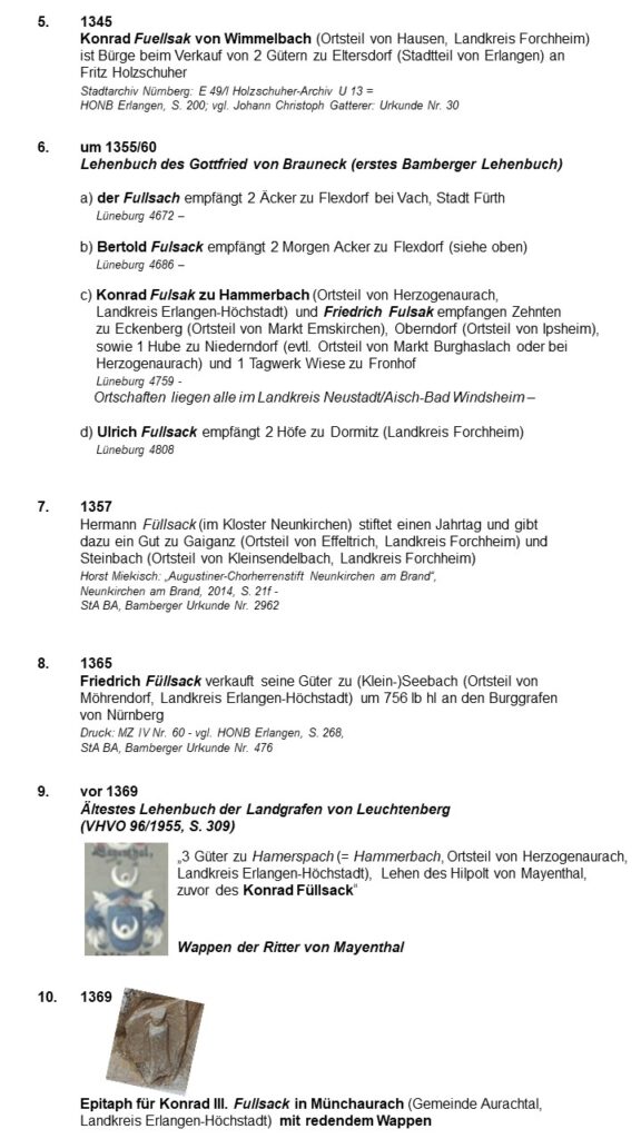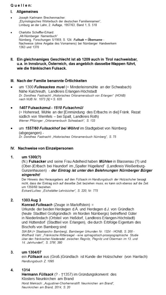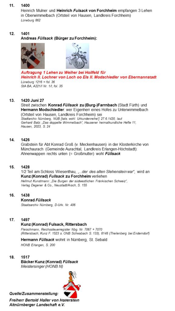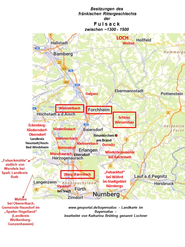 siehe: 01 STAMMBAUM Ermreicher genannt Tetzel/Tetzlein), und 1401 trägt der Ritter Andreas Fulsack (siehe Anhang: Stammbaum und Daten zu diesem Rittergeschlecht), als Forchheimer Bürger, treuhänderisch eine Hube zu Weiher dem Bamberger Bischof zu Lehen auf[6]. In der Urkunde heißt es darüber hinaus „…residenti in Lochenn prope Holfelt“[7], wo er 1403 verstirbt. Er ist verheiratet mit Els II. Modschiedler, aus einem weitverzweigten Ministerialengeschlecht, verwandt mit den Stübig genannt Neideckern, d.h. sie sind stammes- und wappengleich mit diesen und Seitenlinien der mächtigen Förtsch von Thurnau, einem fränkisch-slawischen Clan (Briswizze = heute Oberpreuschwitz, Ortsteil von Bayreuth – siehe auch: Förtsch von Thurnau, Stübig/Neidecker und Modschiedler). Biedermann kennt ihn zu den Jahren 1356, 1367 und 1372.