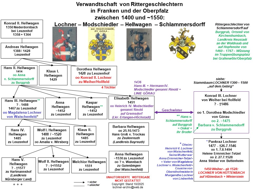 Der Spitzenahne, Werner I. Lochner von Weiher bei Hollfeld, dieser Linie hat zwei Söhne, zum einen Konrad II. und Hans IV. Lochner. Konrad II. Lochner hat sich mit Dorothea seine Ehefrau aus dem Geschlecht der Hellwagen von Leuzenhof genommen und sie haben gemeinsam vier Töchter (Namen nirgends verzeichnet); sie setzt sich als streitbare Frau nach dem Tod ihres Mannes 1427 erfolgreich in einer Erbschaftssache gegen die Modschiedler vor Gericht durch, und sie handelt mit ihrem Schwager Hans IV. Lochner aus, dass sie im Alter auf Loch bleiben kann[8]. Dieser hat mit Dorotheas Schwägerin, Hans IV. Lochners Ehefrau Katharina I. Modschiedler, drei Söhne gezeugt; er ist ab 1409 Bürger in Hollfeld[9], wobei er zwei Güter zu Drosendorf an der Aufseß hat, die zum Burggut von Neuhaus gehören. Zwischen 1419 – 1433 ist Hans IV. Lochner am markgräflichen Gericht in Kulmbach als Richter tätig – auch er ist in der Riege der Erben 1438[10], als Heinrich III. Lochner von Ebermannstadt ohne Kinder stirbt.