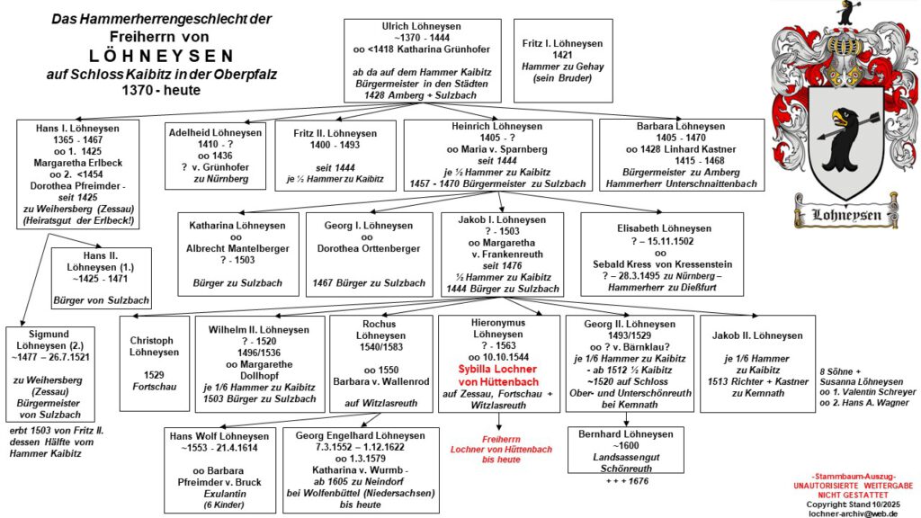 Margaretha Anna aus seiner 1. Ehe, sie heiratet Ulrich Groß von Trockau genannt Christanz[14], und Dorothea Lochner aus der 1. Ehe, die sich 1540 mit Joachim von Machwitz zu Lauterbach vermählt[15]. Kurioserweise heißt eine Tochter aus seiner 2. Ehe ebenfalls Dorothea, diese wird Hans Sigmund von und zu Bertholdshofen[16] aus der Oberpfalz versprochen. Auch die Tochter Sybilla Lochner (aus 1. Ehe) vermählt sich zunächst mit Veit Pfreimder von Bruck in der Oberpfalz, um dann als Witwe am 10. Oktober 1544 mit Hieronymus von Löhneysen ein zweites Mal die Ehe einzugehen. Sie leben auf Zessau (später Weihersberg, heute Ortsteil von Trabitz, Landkreis Neustadt an der Waldnaab) und Witzlasreuth (Ortsteil von Kulmain, Landkreis Tirschenreuth) – dort lebt noch sein Bruder Rochus von Löhneysen, dessen Sohn Georg Engelhard von Löhneysen (1552 -1622) wird in die Dienste der Herzöge von Braunschweig-Wolfenbüttel im heutige Niedersachsen treten und 1605 dort das Rittergut Neindorf erwerben. Er betätigt sich zusätzlich als Verleger und Schriftsteller, u.a. seiner „Aulico politica“, die seine Söhne 1624 posthum herausbringen. Sein Ruf ist der eines „Huttens von Niedersachsen“. Diese Linie ist bis heute existent (siehe Anhang: Stammbaum-Auszug zum Oberpfälzer Hammerherrengeschlecht der Freiherrn von Löhneysen).