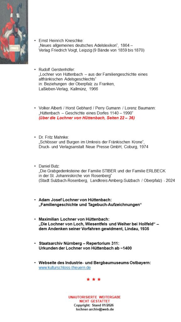 aus der Familiengeschichte eines altfränkischen Adelsgeschlechts, die Lochner von Hüttenbach“, aus: Die Oberpfalz, Laßleben-Verlag, Kallmünz, 1966 ↑ -