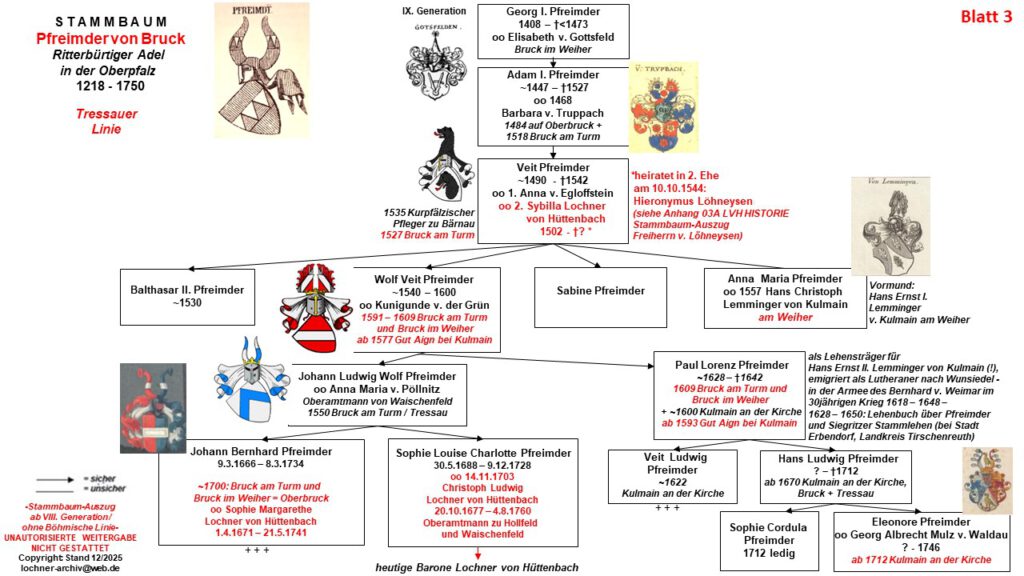 Dort haben sich inzwischen die beiden Söhne von Liborius Georg Sebastian Lochner von Hüttenbach aus der Ehe mit Anna Maria von Aufseß arrangiert, denn 1730 erwirbt der jüngere Sohn, der fürstbischöflich-bambergische Oberamtmann von Hollfeld und Waischenfeld, Christoph Ludwig (20.10.1677 – 4.8.1760), das Schlossgut Lindenberg bei Kasendorf im Landkreis Kulmbach, wo seine Nachfahren kurzzeitig leben werden (er ist Ahnherr der beiden heute existierenden Linien in München und Emmerich am Rhein), so wie bereits zuvor 1714 das Rittergut Riegelstein (heute Stadt Betzenstein im Landkreis Bayreuth). Seine Ehefrau, Sophie Louise Charlotte Pfreimder von Bruck (30.5.1688 – 9.12.1728) ist die Tochter des vorherigen Oberamtmanns von Waischenfeld, Johann Ludwig Wolf Pfreimder von Bruck, die aus Oberpfälzischem Uradel stammen; die Familie sind Stammes- und Wappengenossen der Geschlechter von Trautenberg, Wilde von Wildenreuth, von Waldeck und Erlbeck – im Spätmittelalter sind die Landgrafen von Leuchtenberg und die Pfalzgrafen bei Rhein (Haus Wittelsbach) ihre Lehnsherrn (siehe Anhang: Stammbaum-Auszug der Pfreimder von Bruck).